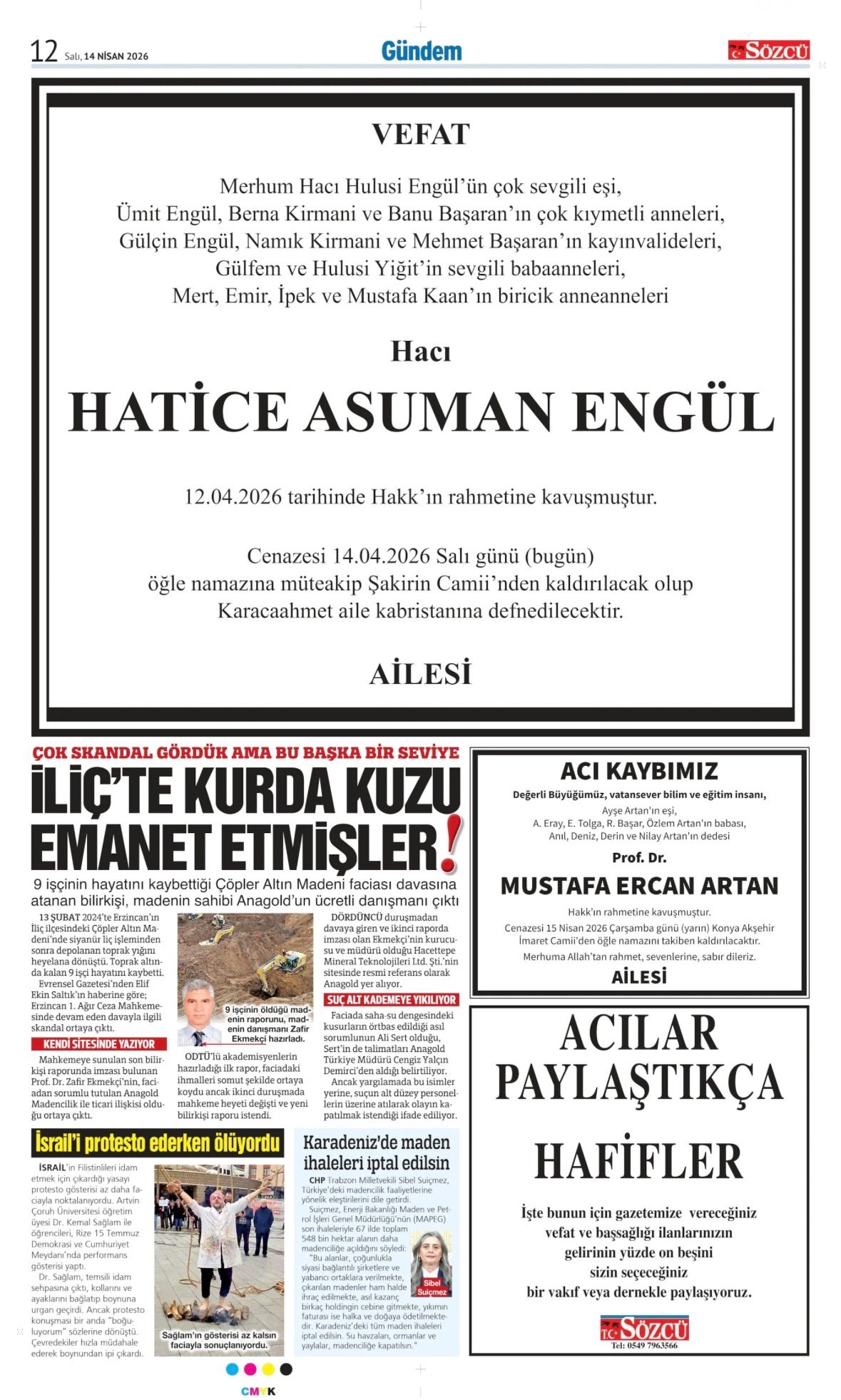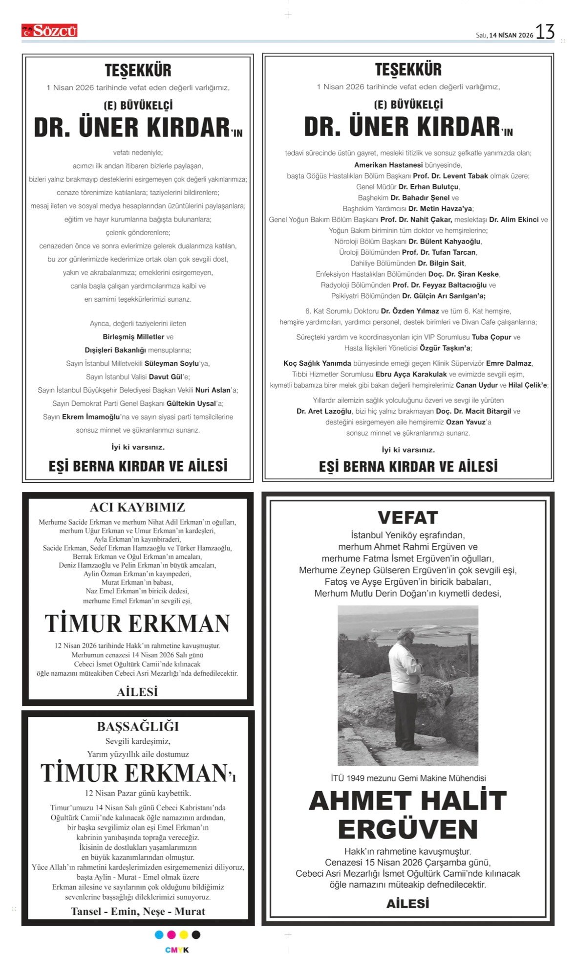 14 Nisan 2026 tarihli Sözcü Gazetesi vefat, başsağlığı ve anma ilanları. İstanbul, Ankara, İzmir ve Adana baskılarında yer alan ilanlar yayınlanmaktadır.
