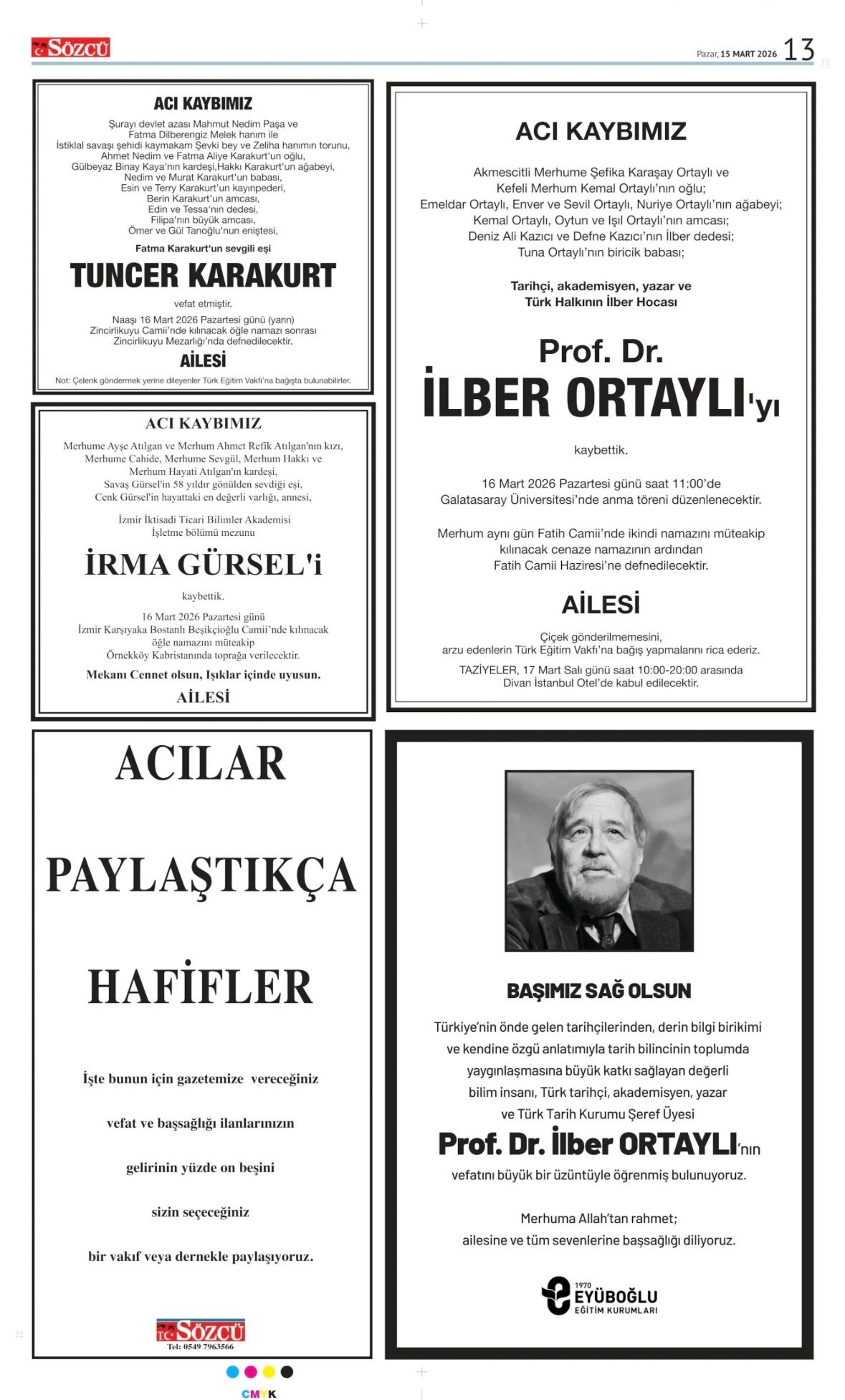 15 Mart 2026 Sözcü Gazetesi vefat, başsağlığı ve anma ilanları. İlan vermek için 0533 504 01 01 numaralı hattı arayın.