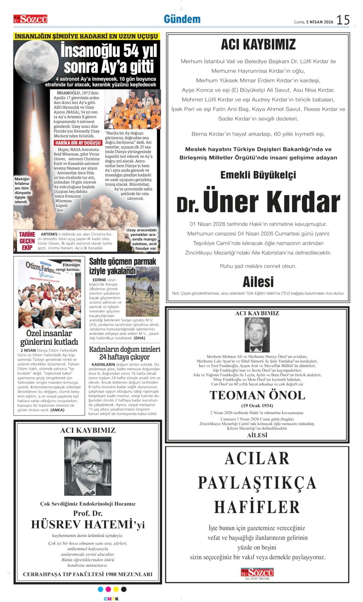 3 Nisan 2026 Sözcü Gazetesi vefat, başsağlığı ve anma ilanları. İlan vermek için 0533 504 01 01 numaralı hattı arayın.