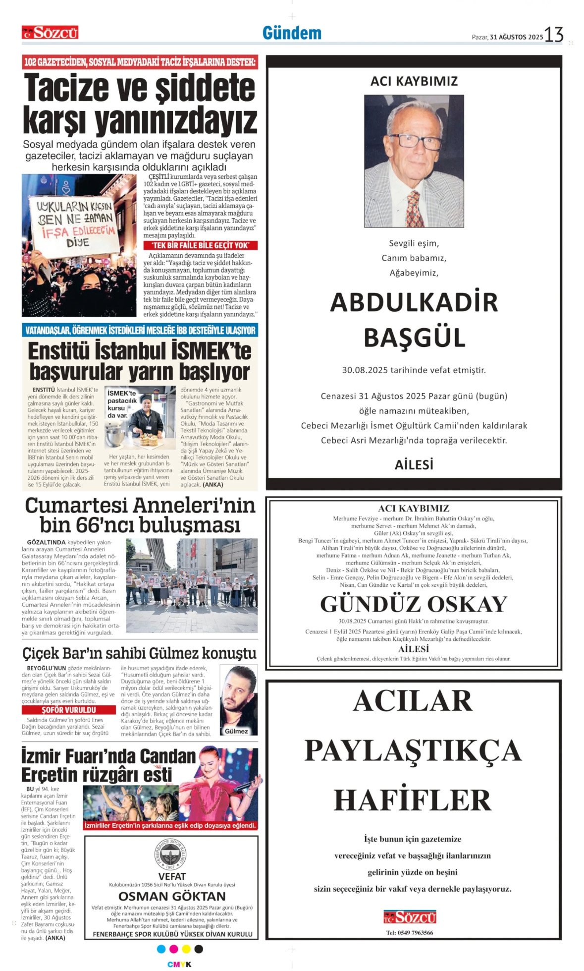 Sözcü Bugünkü Vefat İlanlar 31.8.2025; ABDULKADİR BAŞGÜL - Vefat İlanı, GÜNDÜZ OSKAY - Vefat İlanı, OSMAN GÖKTAN - Vefat İlanı, …