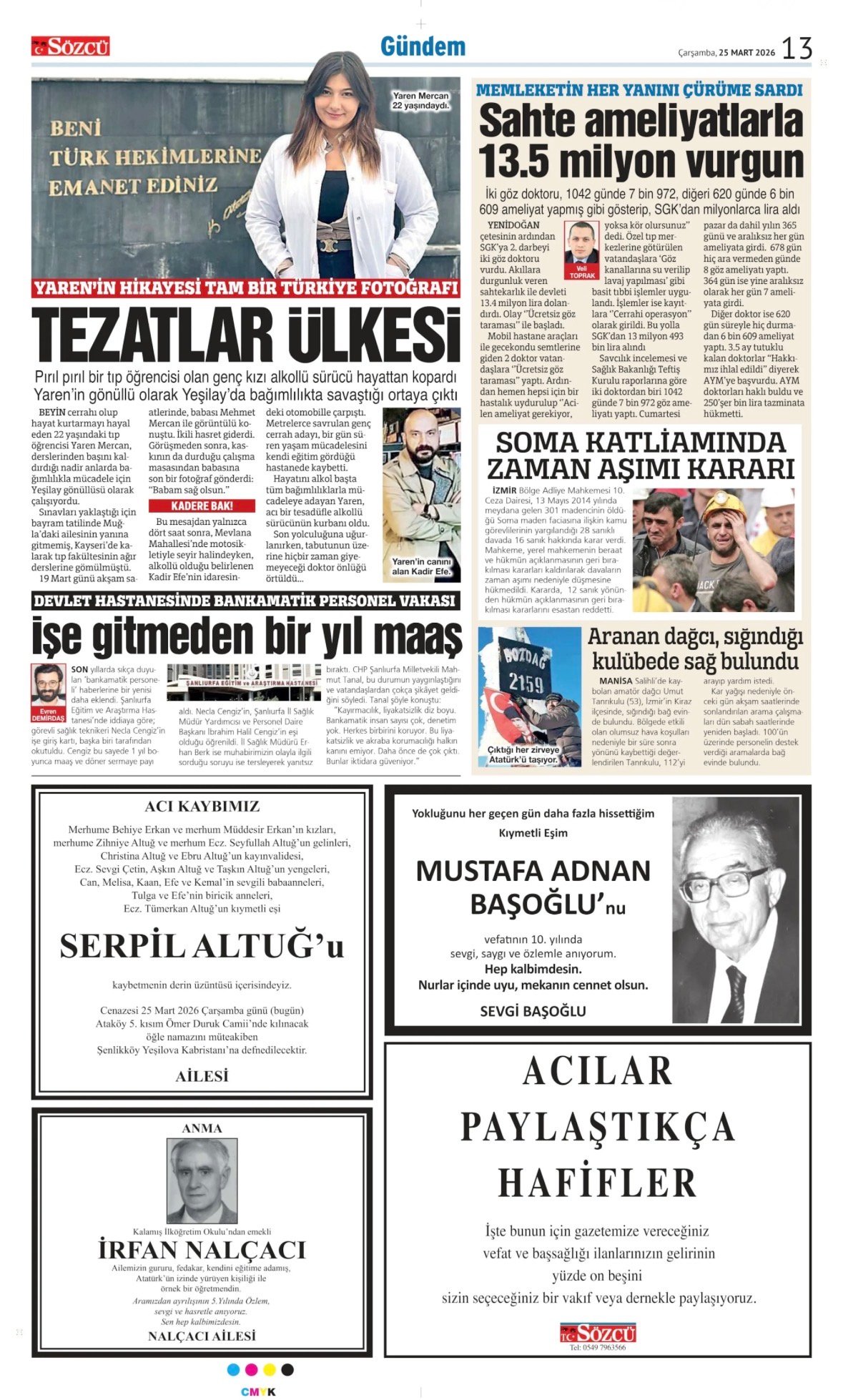 25 Mart 2026 Sözcü Gazetesi vefat, başsağlığı ve anma ilanları. İlan vermek için 0533 504 01 01 numaralı hattı arayın.