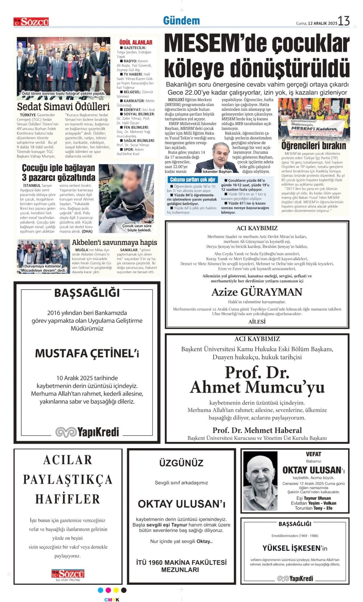 Sözcü Bugünkü Vefat İlan- Başsağlığı İlanı- Anma İlanları ve Arşiv Sayfalar. 12.12.2025