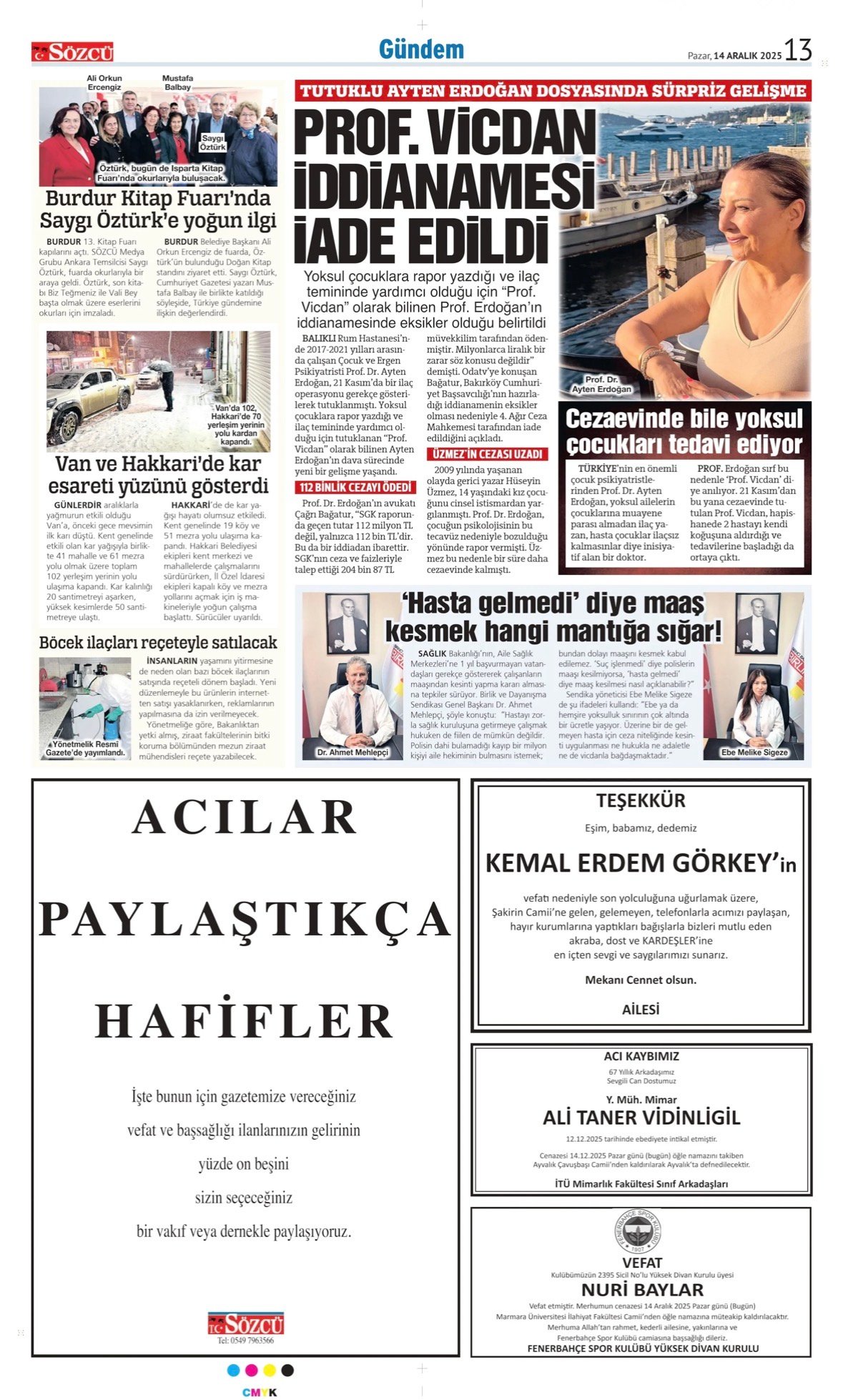 Sözcü Bugünkü Vefat İlan- Başsağlığı İlanı- Anma İlanları ve Arşiv Sayfalar. 14.12.2025