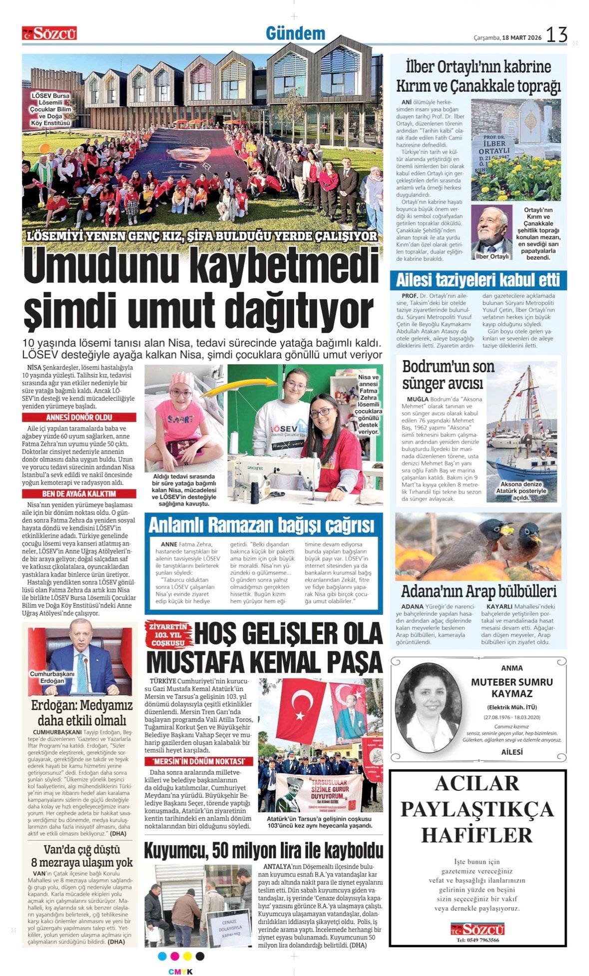18 Mart 2026 Sözcü Gazetesi vefat, başsağlığı ve anma ilanları. İlan vermek için 0533 504 01 01 numaralı hattı arayın.