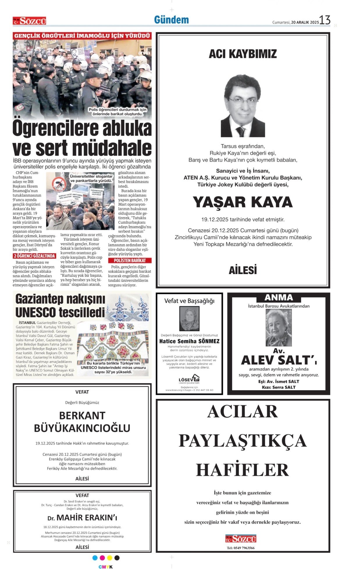 Sözcü Bugünkü Vefat İlan- Başsağlığı İlanı- Anma İlanları ve Arşiv Sayfalar. 19.12.2025