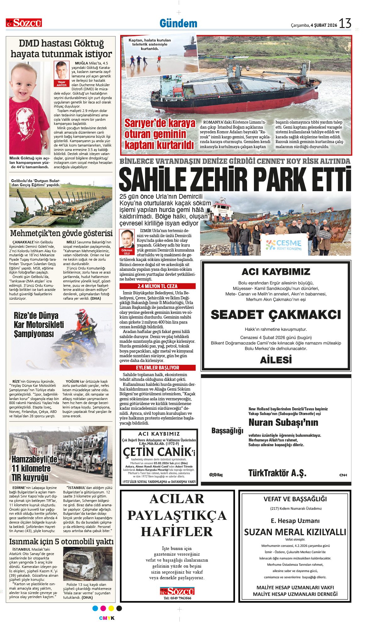 Sözcü Bugünkü Vefat (Ölüm) – Başsağlığı – Anma – Teşekkür – Mevlit İlanları-13.2.2026