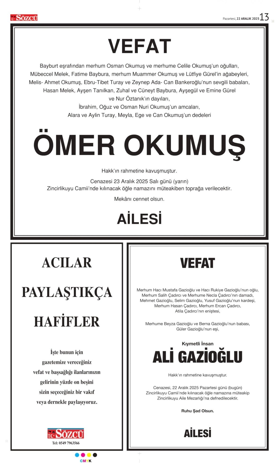 Sözcü Bugünkü Vefat İlan- Başsağlığı İlanı- Anma İlanları ve Arşiv Sayfalar. 13.12.2025