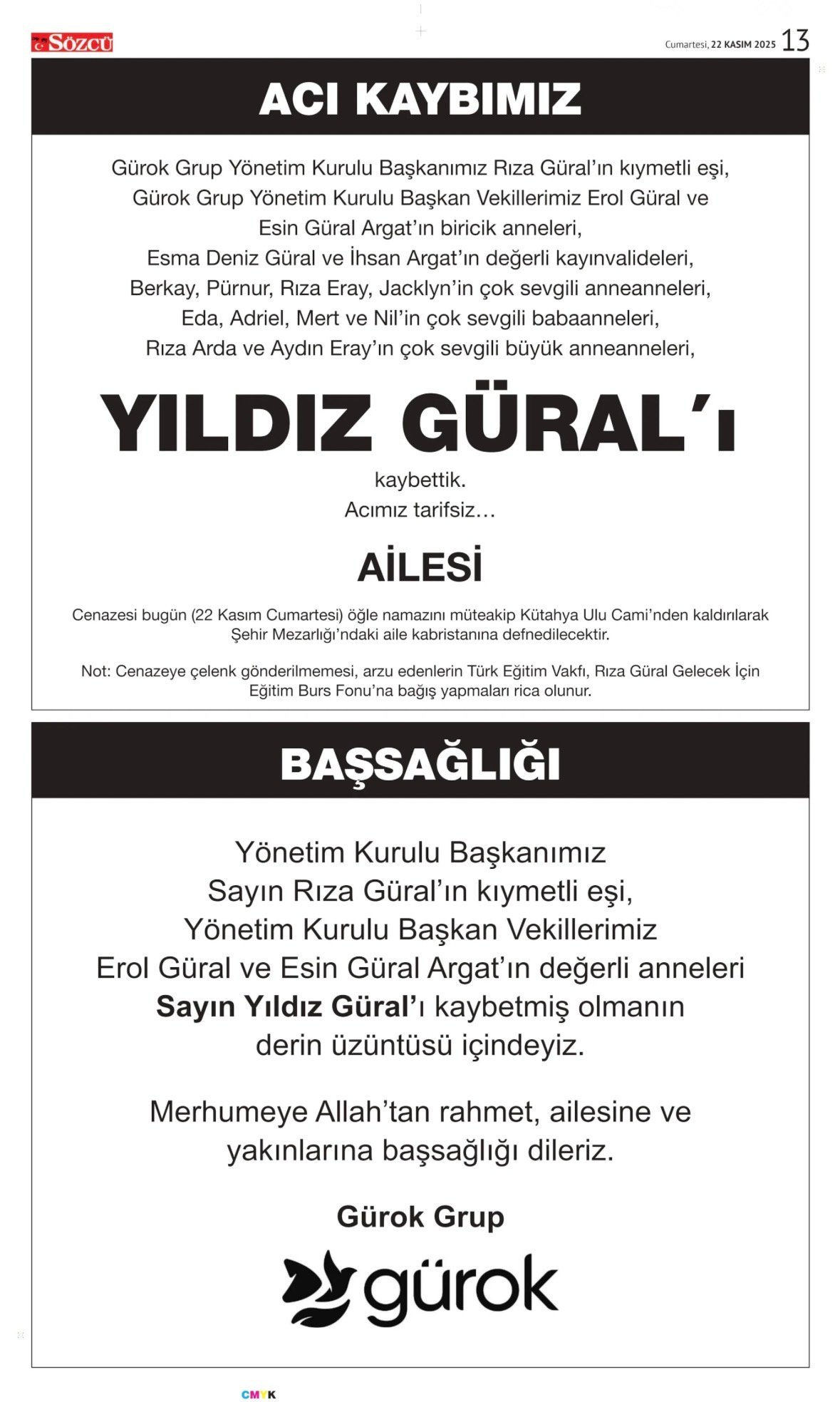 YILDIZ GÜRAL – VEFAT İLANI,